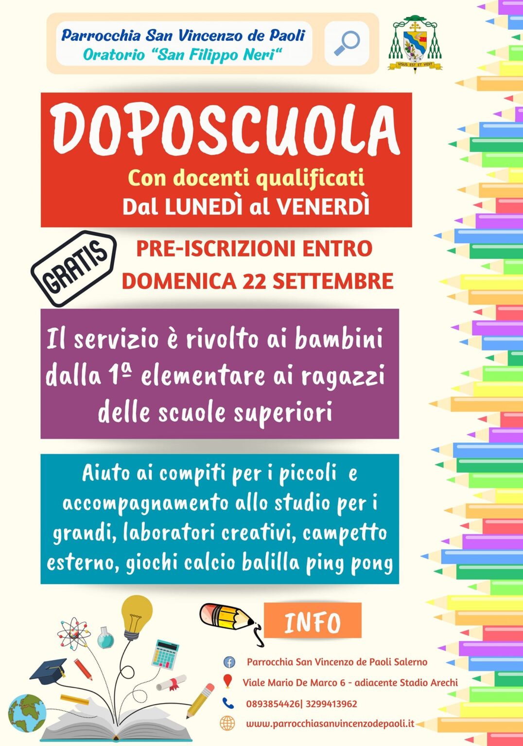 DOPOSCUOLA con DOCENTI2 Settembre 2024In evidenza PRE-ISCRIZIONI entro il 22 settembre il servizio è rivolto ai bambini dalla 1a elementare ai ragazzi delle scuole superiori. Aiuto ai compiti per i piccoli e accompagnamento allo studio per i grandi, laboratori creativi, campetto esterno, giochi, calcio balilla e ping pong.